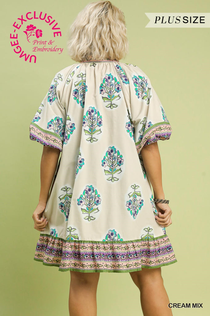 Flower V-Neck Printed Dress with ruffled boarder hem and short wide sleeves. Fully lined.
