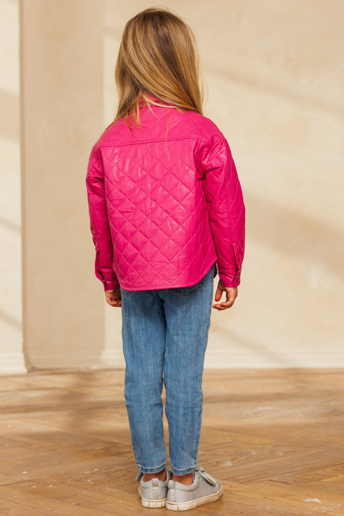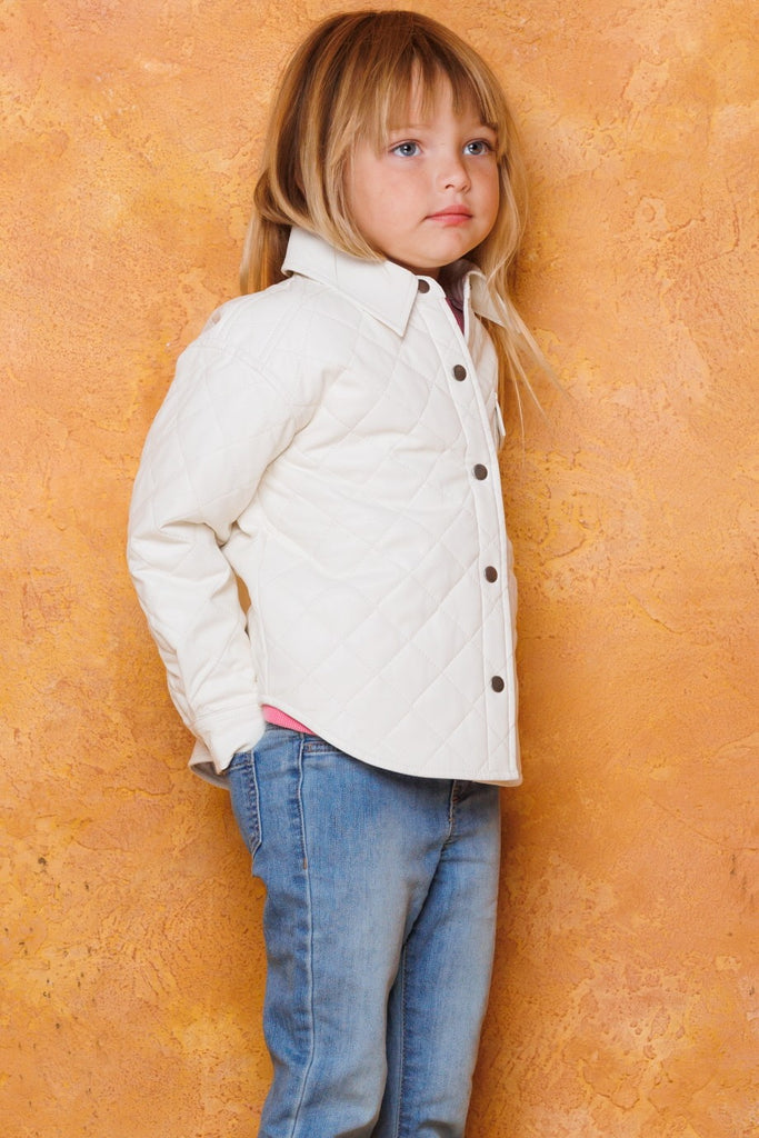 Diamond quilted leather jacket featuring front button down, snap closure, and breast pockets.