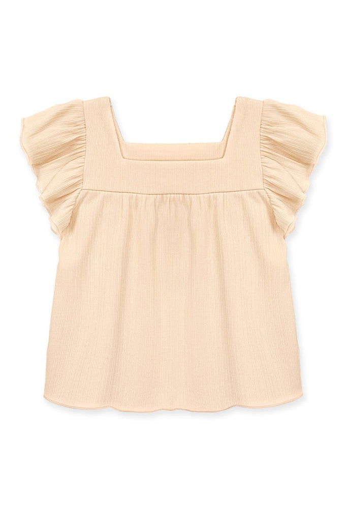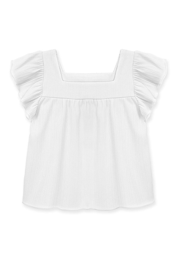 Girls fashion top with square neck and ruffle sleeves.