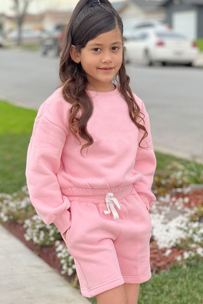 Girls 2 piece jog set with ribbed neckline and smocked elastic waistband.