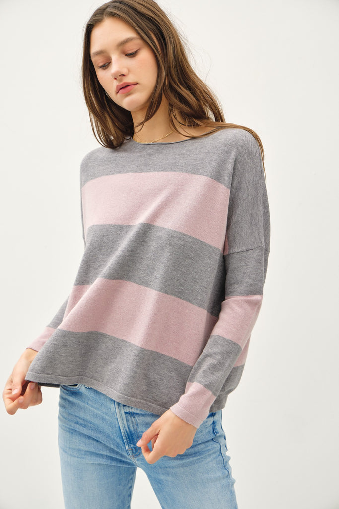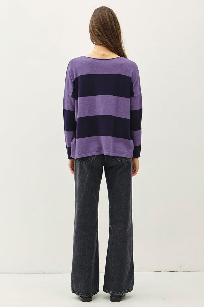 Soft sweater with wide striped design and boat neckline.