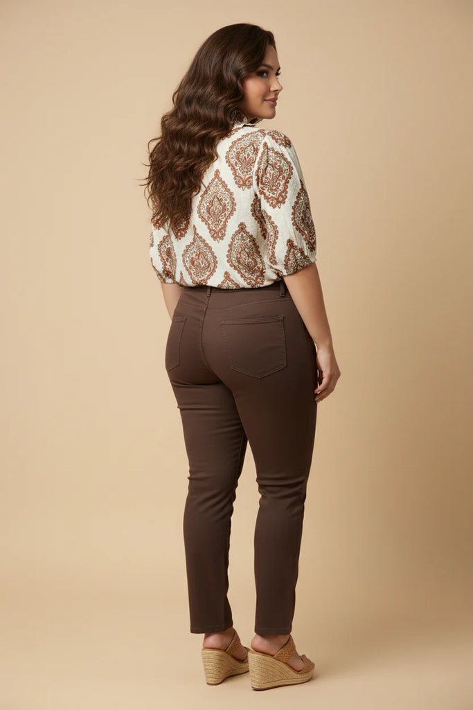 V-neck top with block print fabric, ruffle collar and short cuffed sleeves.