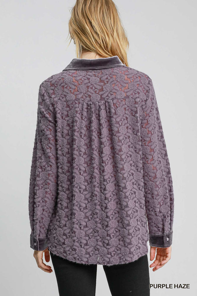Lace button down top details • fleece lace material • velvet contrasting • not lined fit & model notes: • model is 5'9" and is wearing a small. • all measurements are approximate. Fabric contents • 89% nylon • 11% spandex