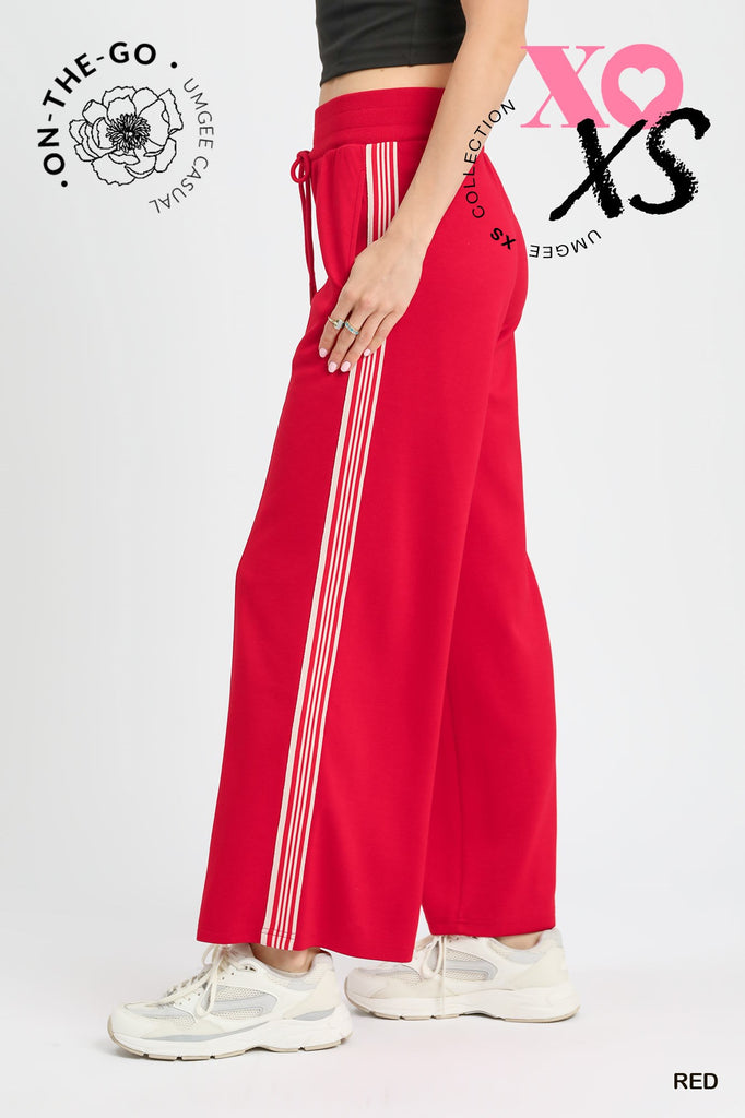 Wide leg athletic stripe pants with elasticized with adjustable drawstring