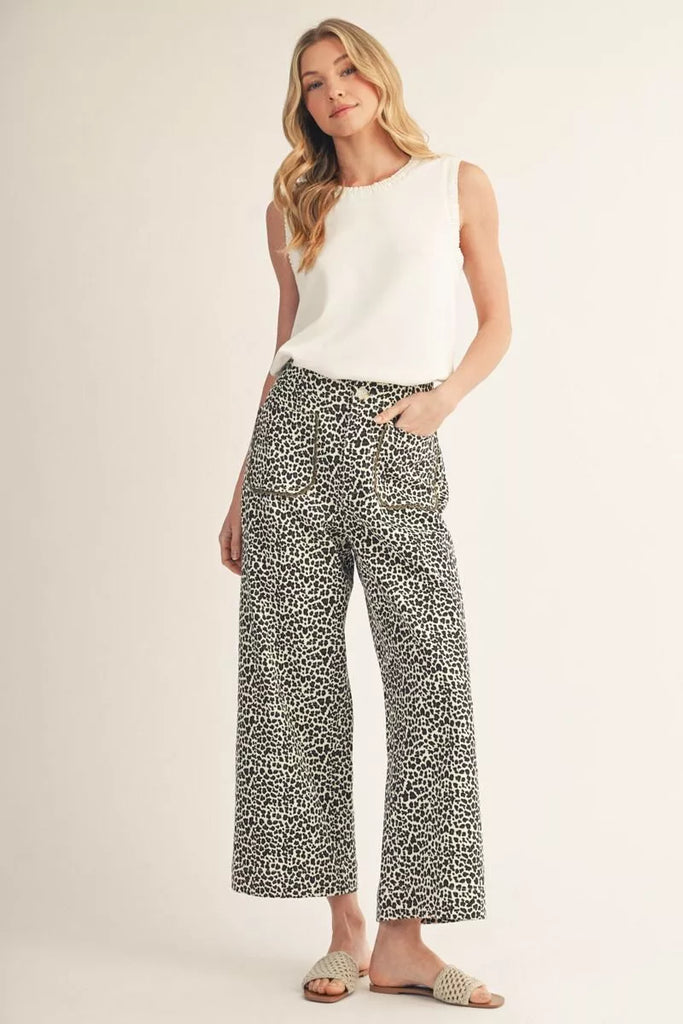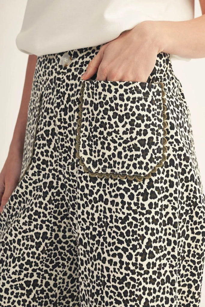High waist wide leg leopard pants with scallop trim accent pockets.