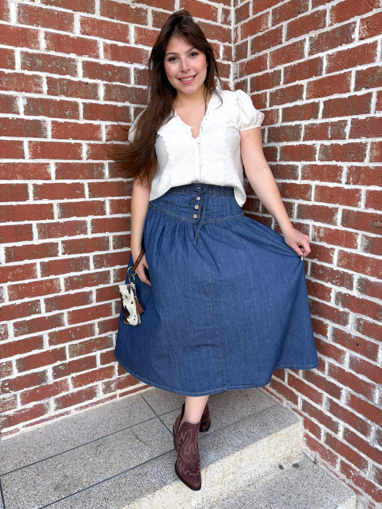 Denim A-line maxi skirt with elastic waist, pintuck yoke detail, and mock button front.