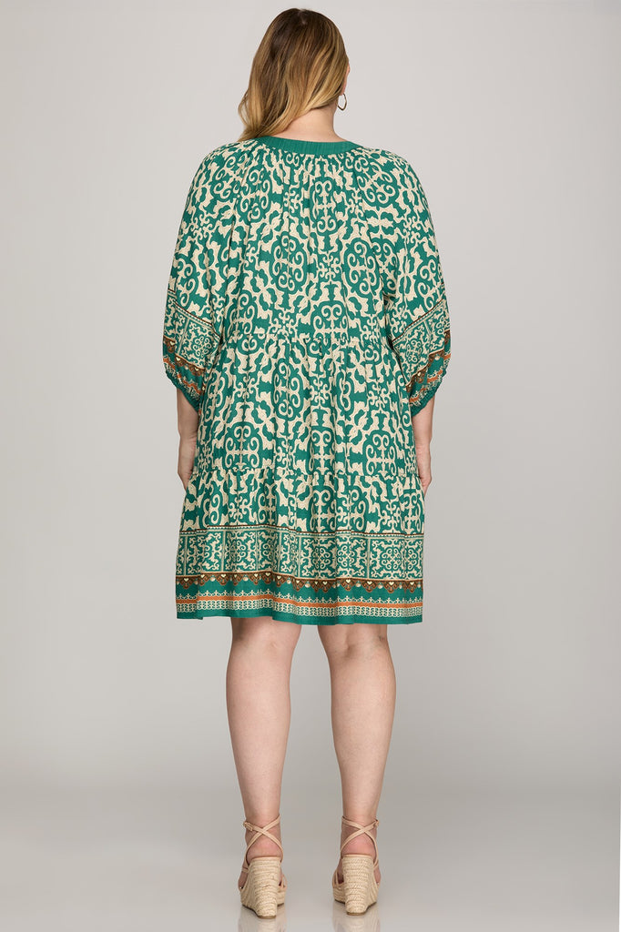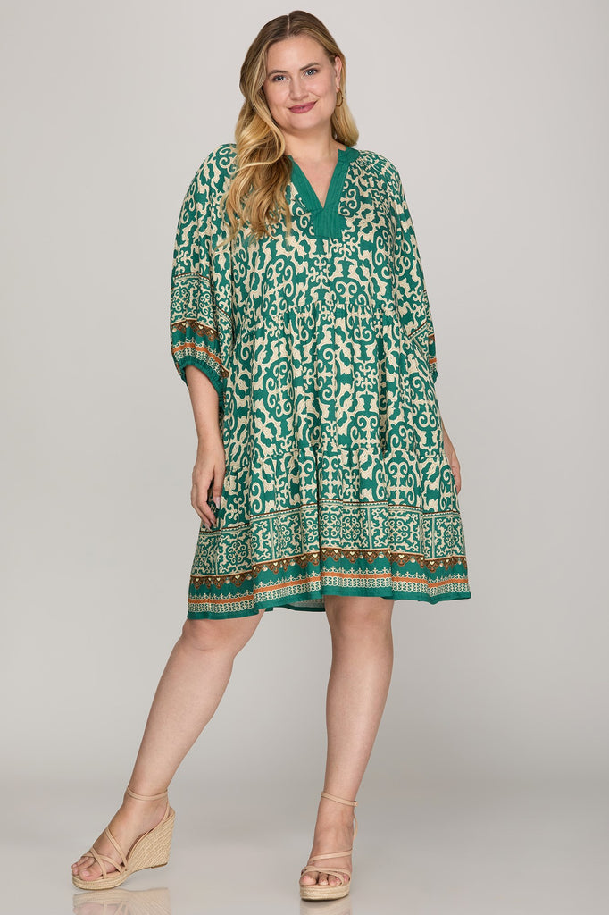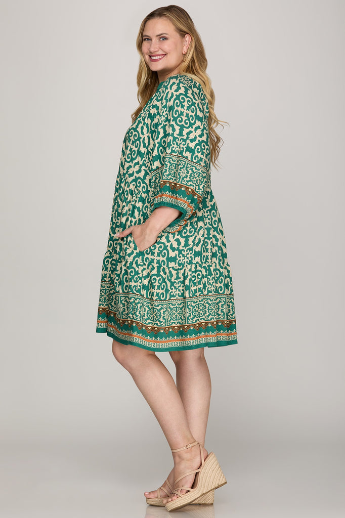 PLUS - 3/4 SLEEVE BORDER PRINT WOVEN TIERED MINI DRESS WITH POCKETS