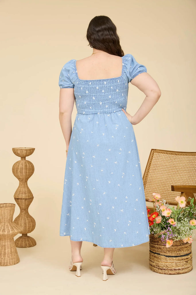 Floral embroidered midi dress with square neckline, short puff sleeves, and smocked bodice.