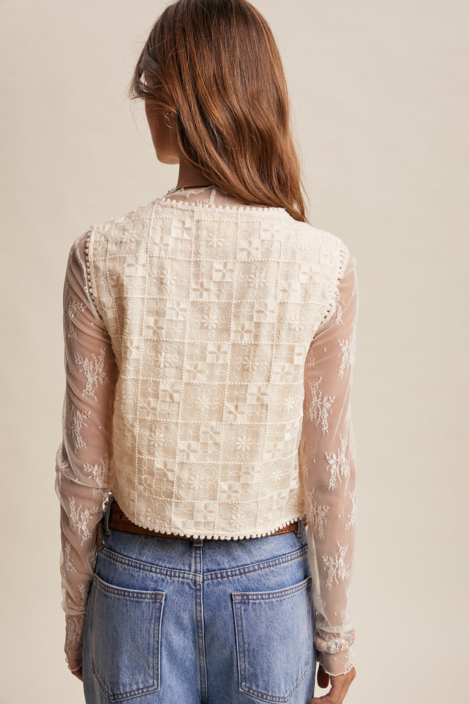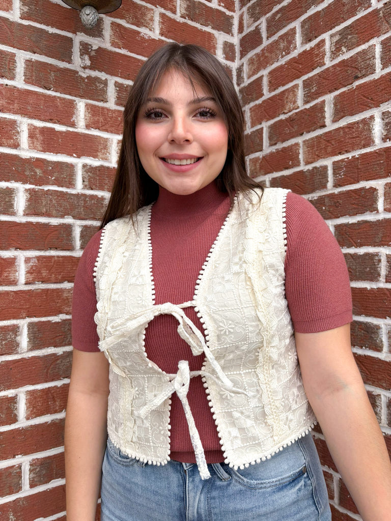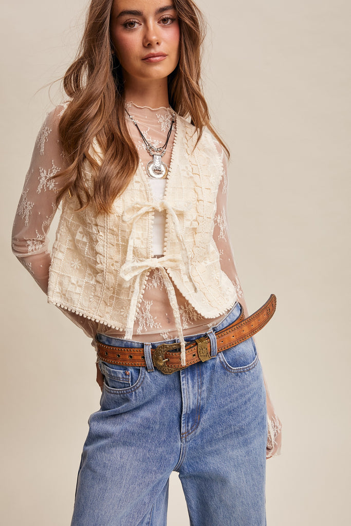 A romantic and effortlessly chic vest, featuring delicate lace and a tie front.