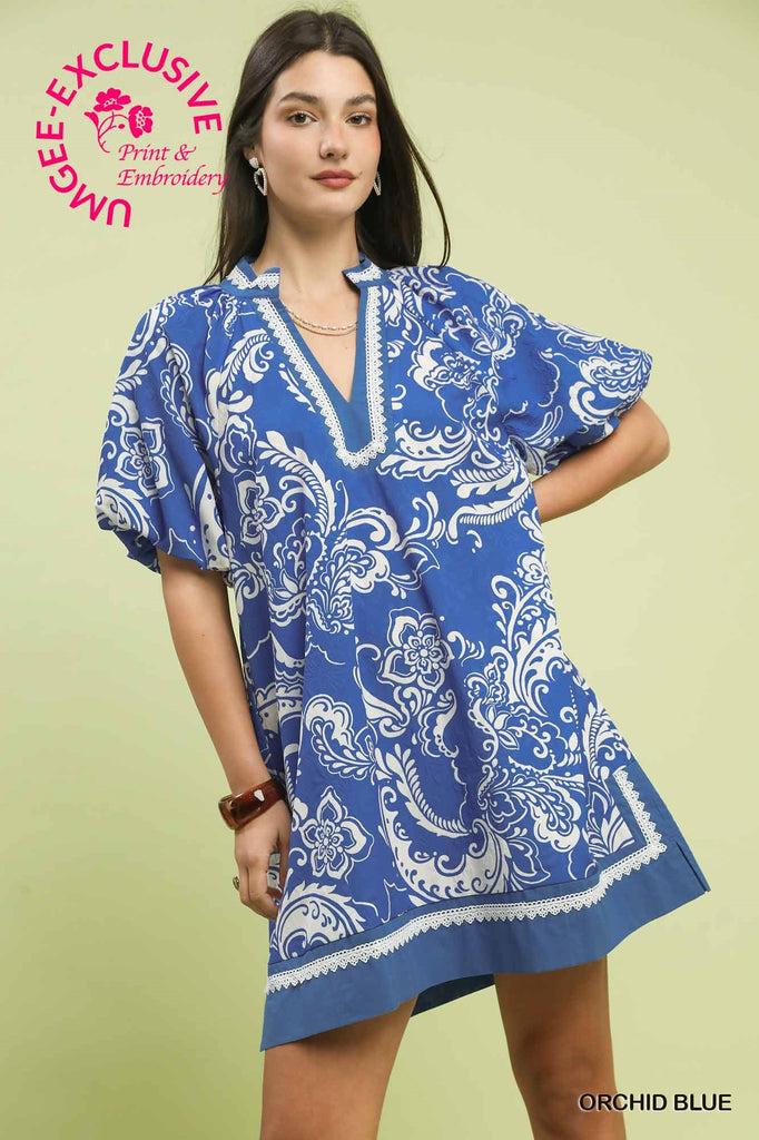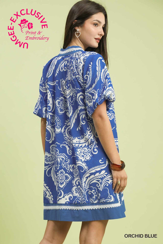 Jacquard two tone mini dress with white lace trim neckline and short puff sleeves.
